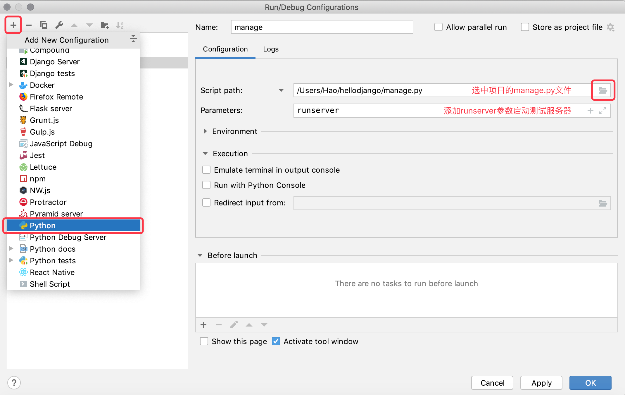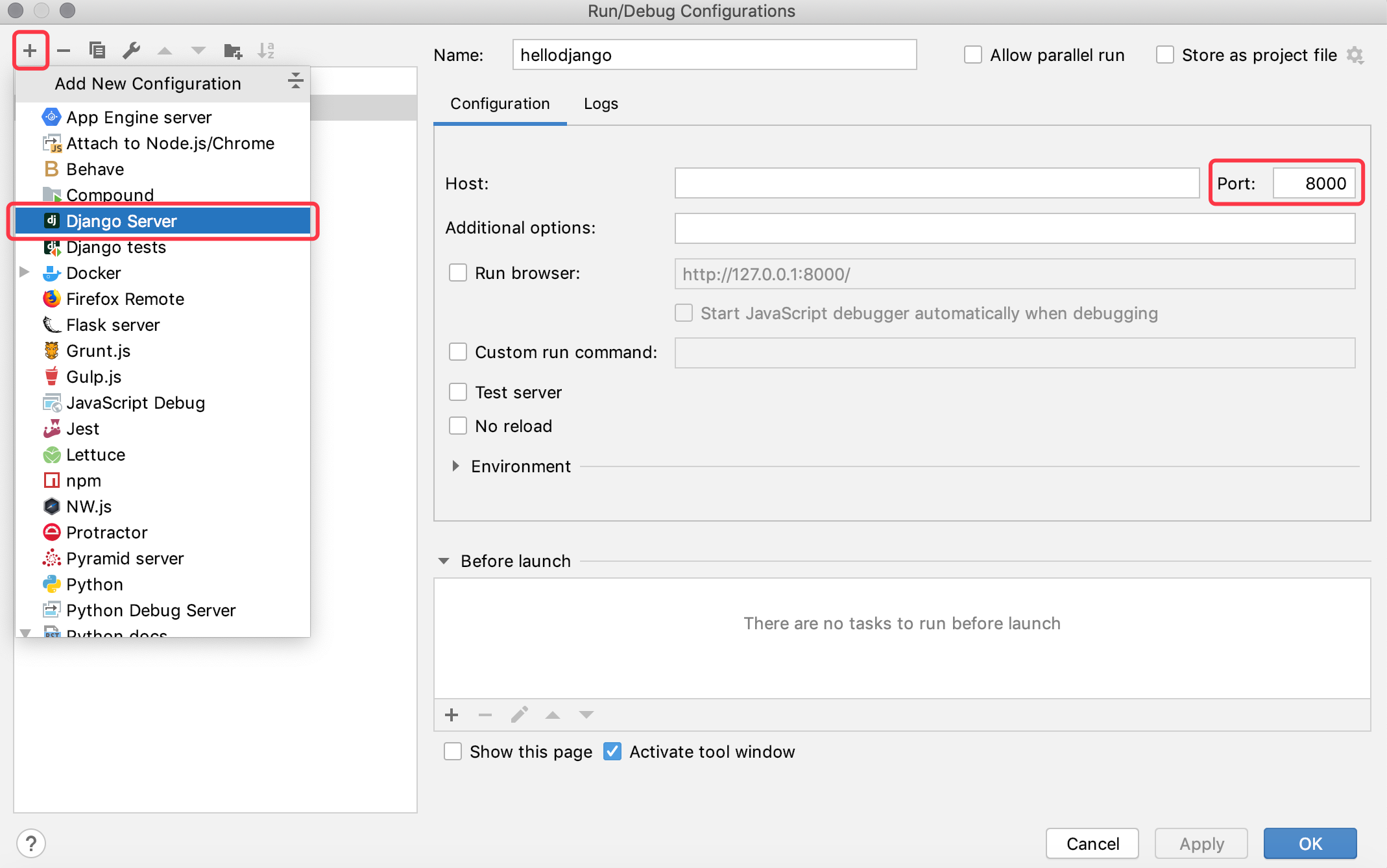 python manage.py runserver启动服务器时,可以在后面添加参数来指定IP地址和端口号,默认情况下启动的服务器将运行在本机的8000端口。- 在终端中运行的服务器,可以通过Ctrl+C来停止它 。通过PyCharm的“运行配置”运行的服务器直接点击窗口上的关闭按钮就可以终止服务器的运行。