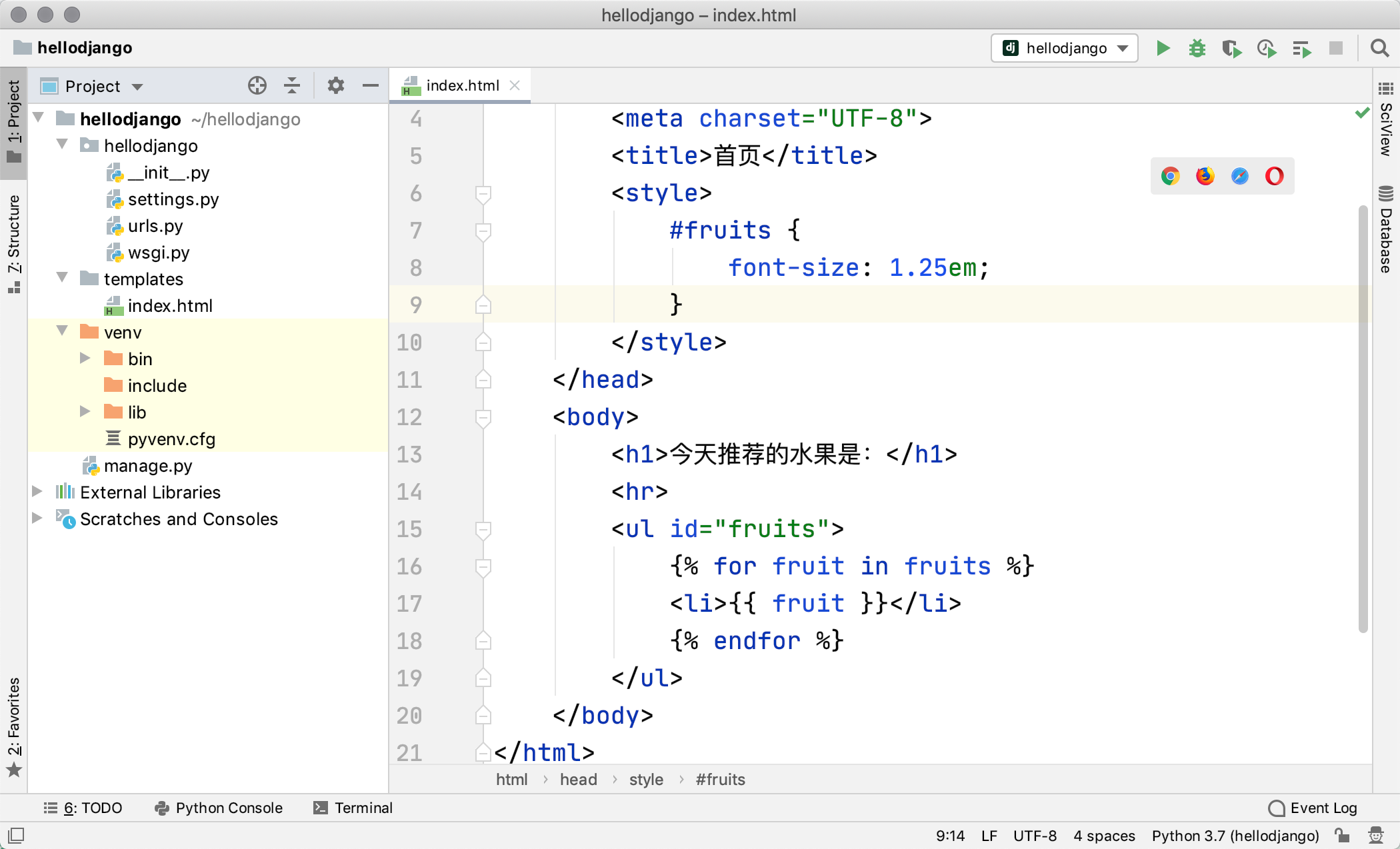 {{ fruit }}这样的模板占位符语法,也使用了{% for %}这样的模板指令,这些都是Django模板语言(DTL)的一部分。关于模板语法和指令,大家可以看看官方文档,相信这些内容还是很容易理解的,并不需要过多的赘述,大家也可以参考官方文档了解模板指令和语法。 - 修改
