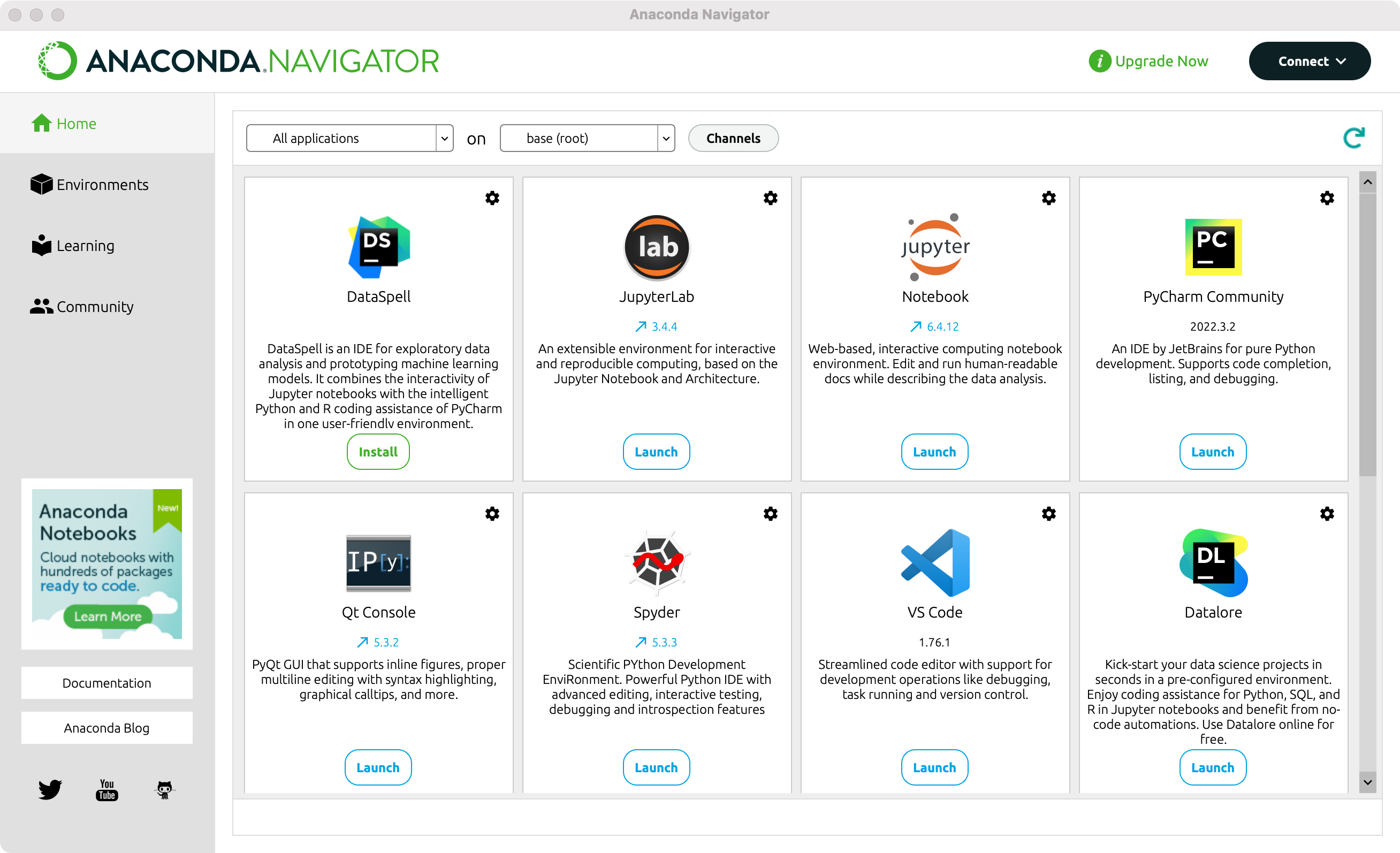 如上图所示,可以通过 Anaconda 官网提供的下载链接选择适合自己操作系统的安装程序,建议大家选择图形化的安装程序,下载完成后双击安装程序开始安装。安装过程基本使用默认设置即可,完成安装后,macOS 用户可以在“应用程序”或“启动台”中找到名为“Anaconda-Navigator”的应用程序,运行该程序可以看到如下所示的界面,我们可以在这里选择需要执行的操作。
