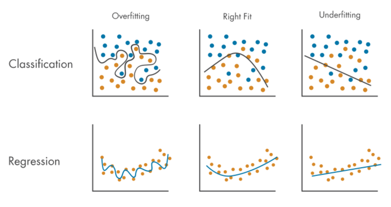 模型评估。模型评估主要的目标是确定模型在新数据(测试集)上的表现,确保模型没有出现过拟合(overfitting)或欠拟合(underfitting),如下图所示。欠拟合会导致模型的预测效果糟糕,而过拟合会导致模型缺乏泛化能力,即在测试集和新数据上表现欠佳。当然,为了提高模型的性能或适应性,可能还要通过正则化、集成学习、算法调整等方式进行调优。
