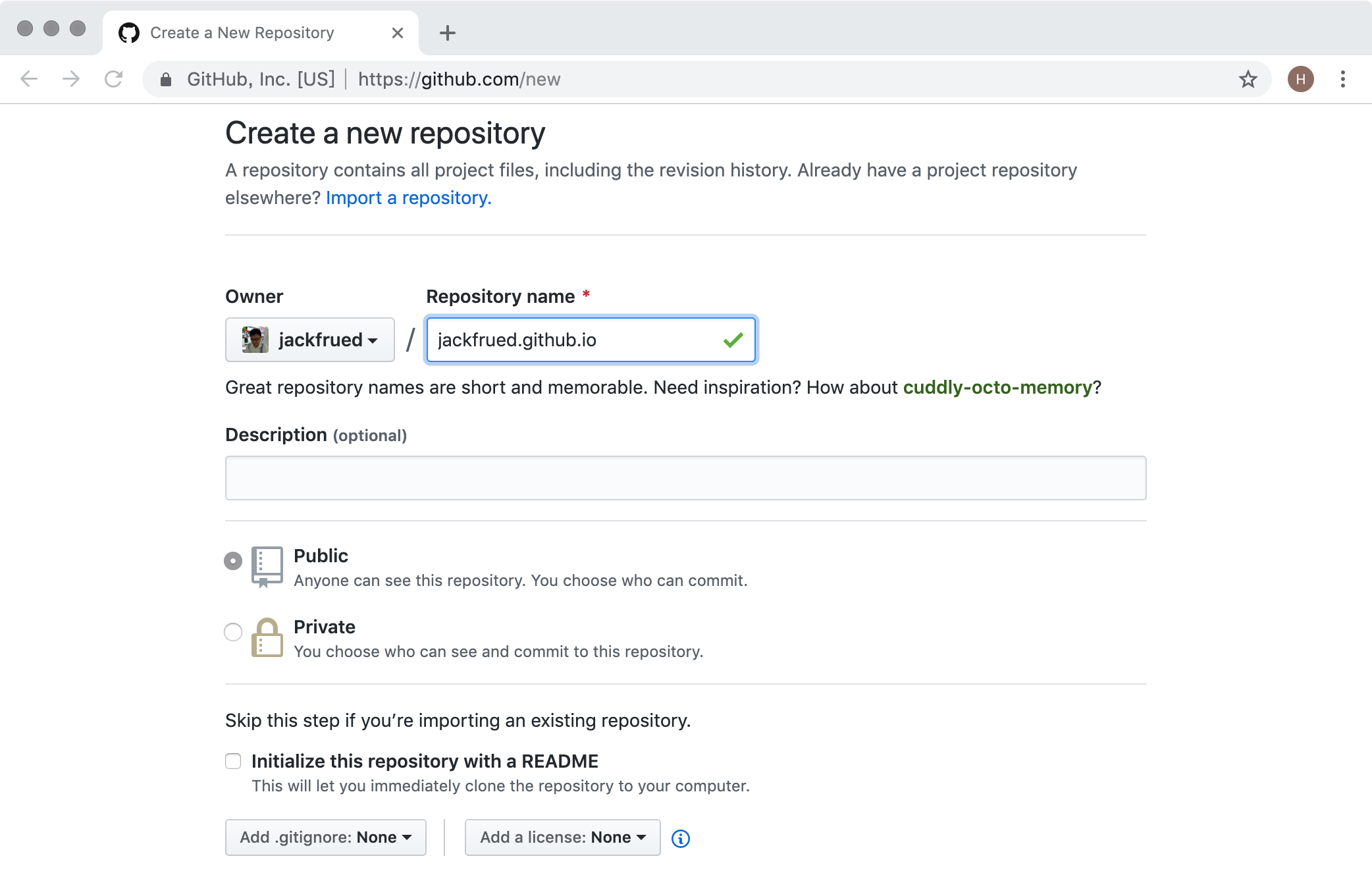 - 根据自己的用户名创建一个仓库,仓库**一定**要取名为“用户名.github.io”。例如:我在GitHub上的用户名是jackfrued,那么我的托管博客项目的仓库一定要命名为jackfrued.github.io。