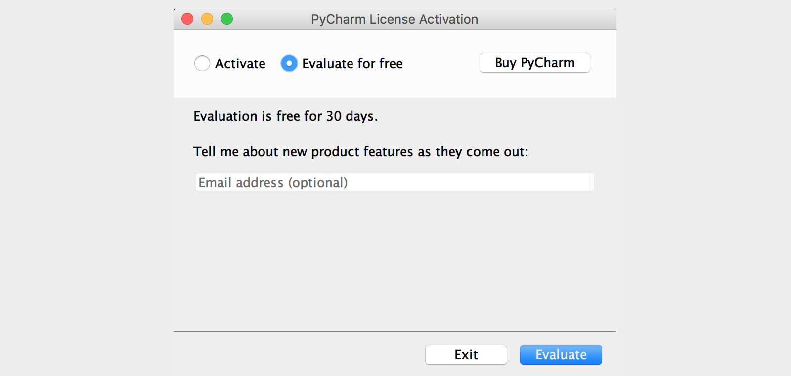 专业版的PyCharm是需要激活的,强烈建议大家在条件允许的情况下支付费用来支持优秀的产品,如果不用做商业用途或者不需要使用PyCharm的高级功能,我们可以暂时选择试用30天或者使用社区版的PyCharm。如果你是一名学生,希望购买PyCharm来使用,可以看看教育优惠官方申请指南。如下图所示,我们需要点击“Evaluate”按钮来试用专业版PyCharm。