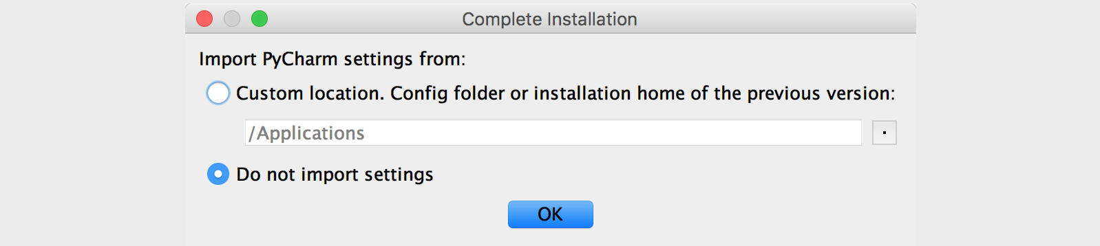 第一次使用PyCharm时,会有一个导入设置的向导,如果之前没有使用PyCharm或者没有保存过设置的就直接选择“Do not import settings”进入下一步即可,下面是我在macOS系统下第一次使用PyCharm时的截图。