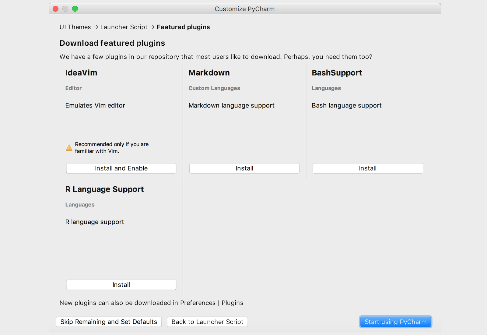 再接下来是创建可以在“终端”或“命令行提示符”中运行PyCharm的启动脚本,当然也可以不做任何勾选,直接点击“Next: Featured plugins”按钮进入下一环节。