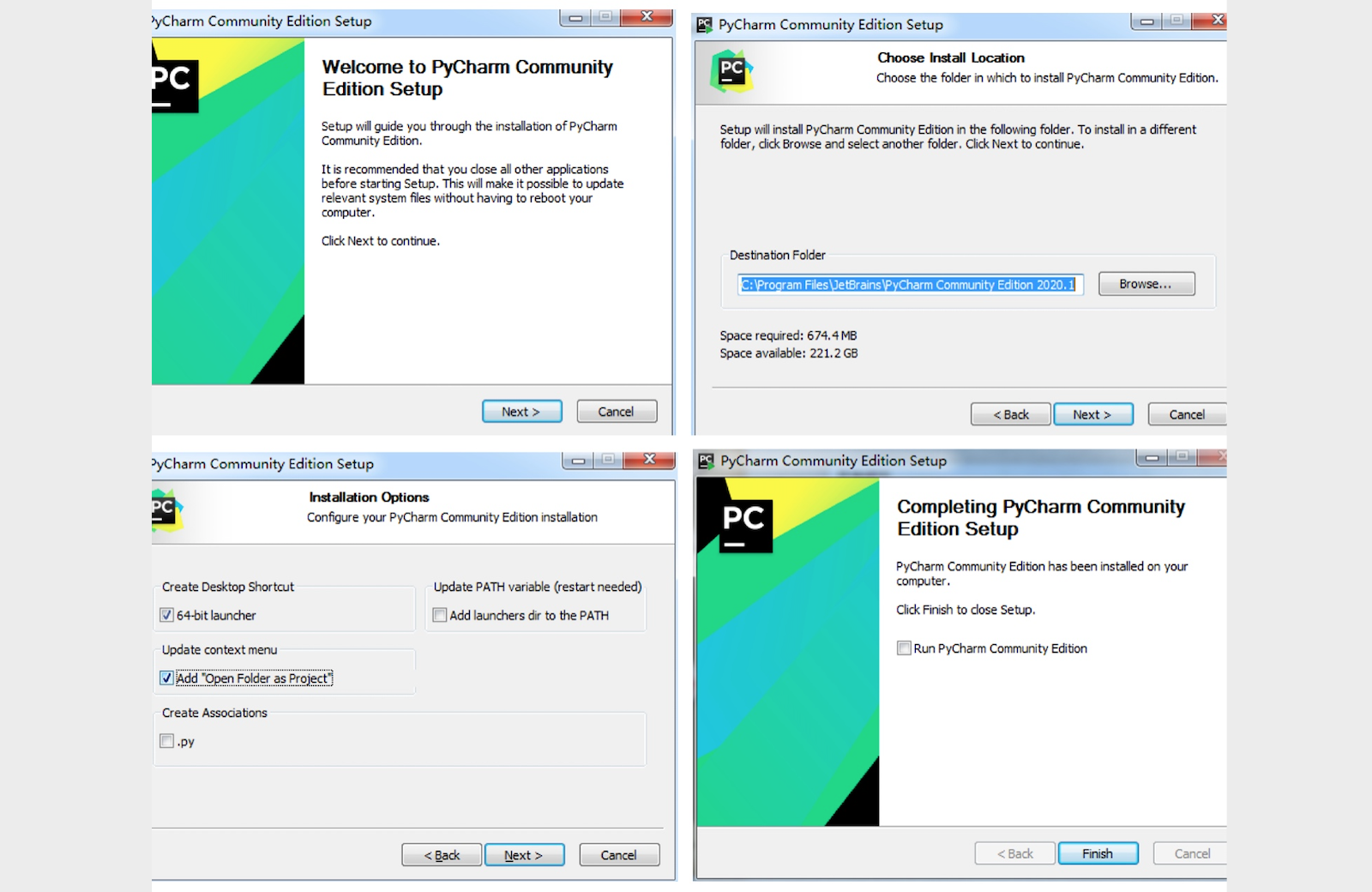 可以在JetBrains公司的官方网站找到PyCharm的下载链接,有两个可供下载的版本,一个是社区版(PyCharm CE),一个是专业版(PyCharm Professional)。社区版在Apache许可证下发布,可以免费使用;专业版在专用许可证下发布,需要购买授权后才能使用,但新用户可以试用30天。很显然,专业版提供了更为强大的功能和对企业级开发的各种支持,但是对于初学者来说,社区版已经足够强大和好用了。安装PyCharm只需要直接运行下载的安装程序,然后持续的点击“Next”(下一步)按钮就可以啦。下面是我在Windows系统下安装PyCharm的截图,安装完成后点击“Finish”(结束)按钮关闭安装向导,然后可以通过双击桌面的快捷方式来运行PyCharm。