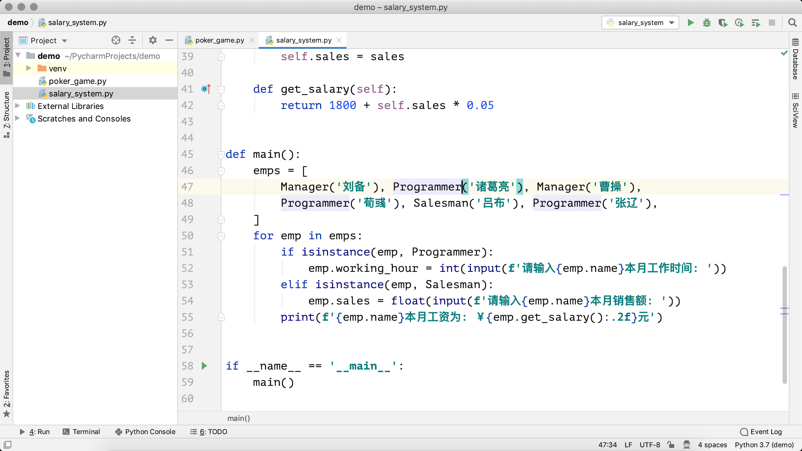 项目创建完成后就可以开始新建各种文件来书写Python代码了,如下图所示。左侧是项目浏览器,可以看到刚才创建的项目文件夹以及虚拟环境文件夹。我们可以在项目上点击鼠标右键,选择“New”,在选择“Python File”来创建Python代码文件,下图中我们创建了两个Python文件,分别是poker_game.py和salary_system.py。当然,如果愿意,也可以使用复制粘贴的方式把其他地方的Python代码文件复制到项目文件夹下。